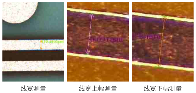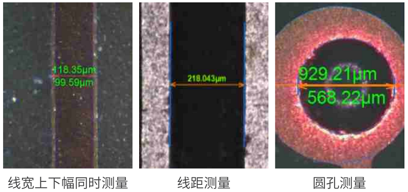 通過(guò)影像成像系統(tǒng)及光源從上表面垂直于被測(cè)板,呈顯影像(相機(jī)實(shí)時(shí)拍圖)感測(cè),并將圖像傳送至電腦測(cè)量軟件,通過(guò)軟件測(cè)量工具分析圖像的“線寬/線距/線寬上下幅/圓/金手指線寬等”標(biāo)準(zhǔn)公差值對(duì)比,從而判斷被測(cè)板上的測(cè)量值OK或NG。