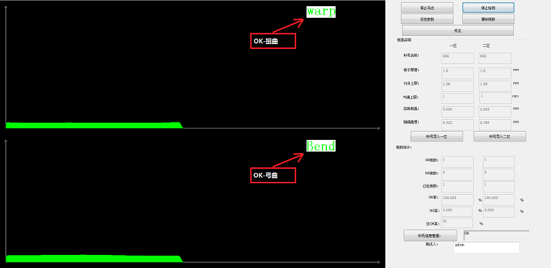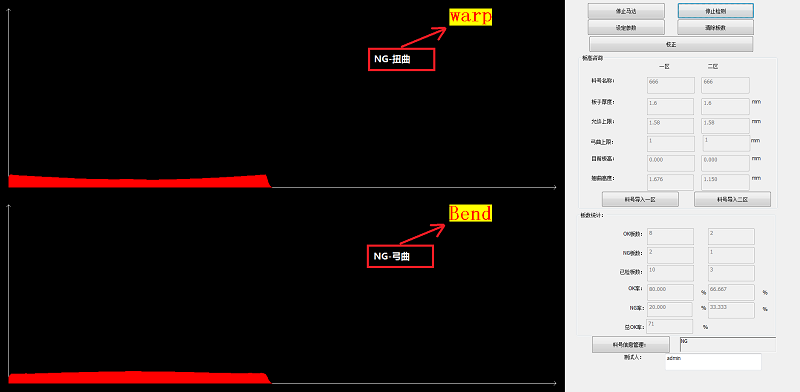 通過(guò)位置的信息可以得到PCB板的板厚曲線(xiàn)圖,通過(guò)特定軟件算法和翹曲度定義,計(jì)算出板翹曲度,并根據(jù)設(shè)定判斷條件得出OK和NG板。