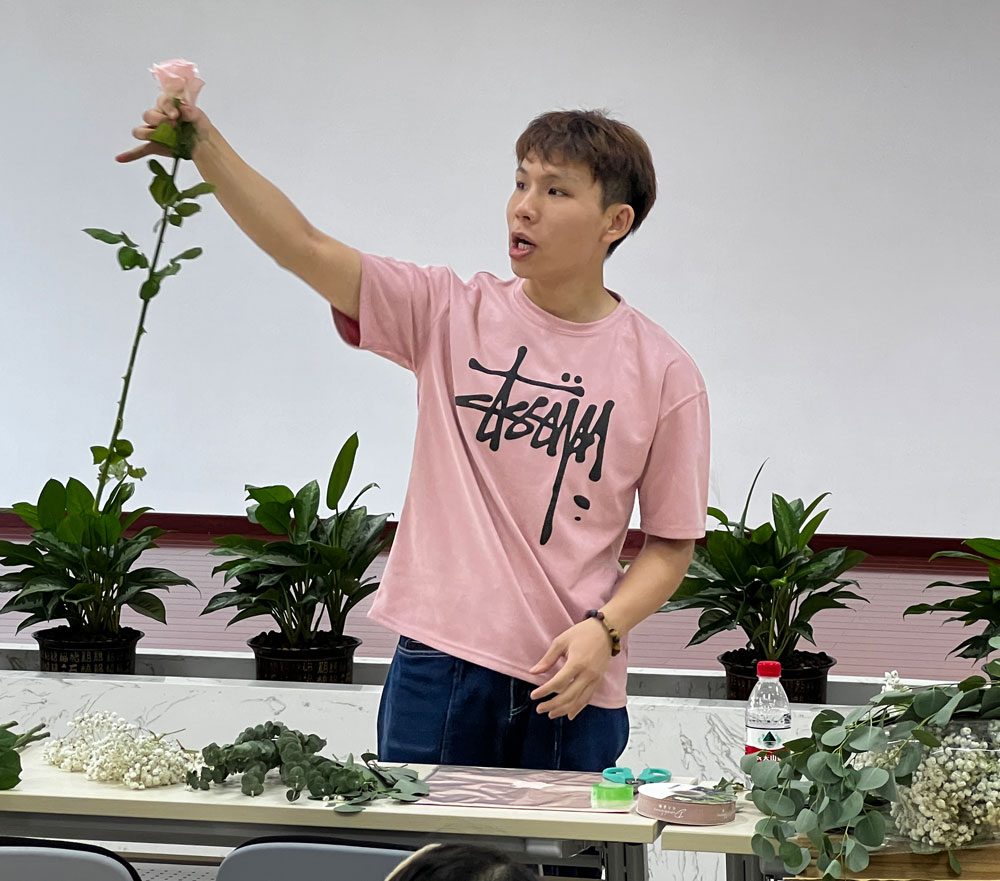 在老師的悉心指導下,大家大膽發(fā)揮自己的想象力,通過自己靈巧的雙手,將經過修剪的多種花材,根據不同的色彩、形狀,有層次地搭配在一起。