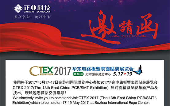 一年一度的華東電路板暨表面貼裝展(CTEX 2017)就要來啦!正業(yè)科技將隆重參加此展會(huì),展示公司最新的技術(shù)成果,至誠邀請新老客戶參加蒞臨我司展位觀摩指導(dǎo)。